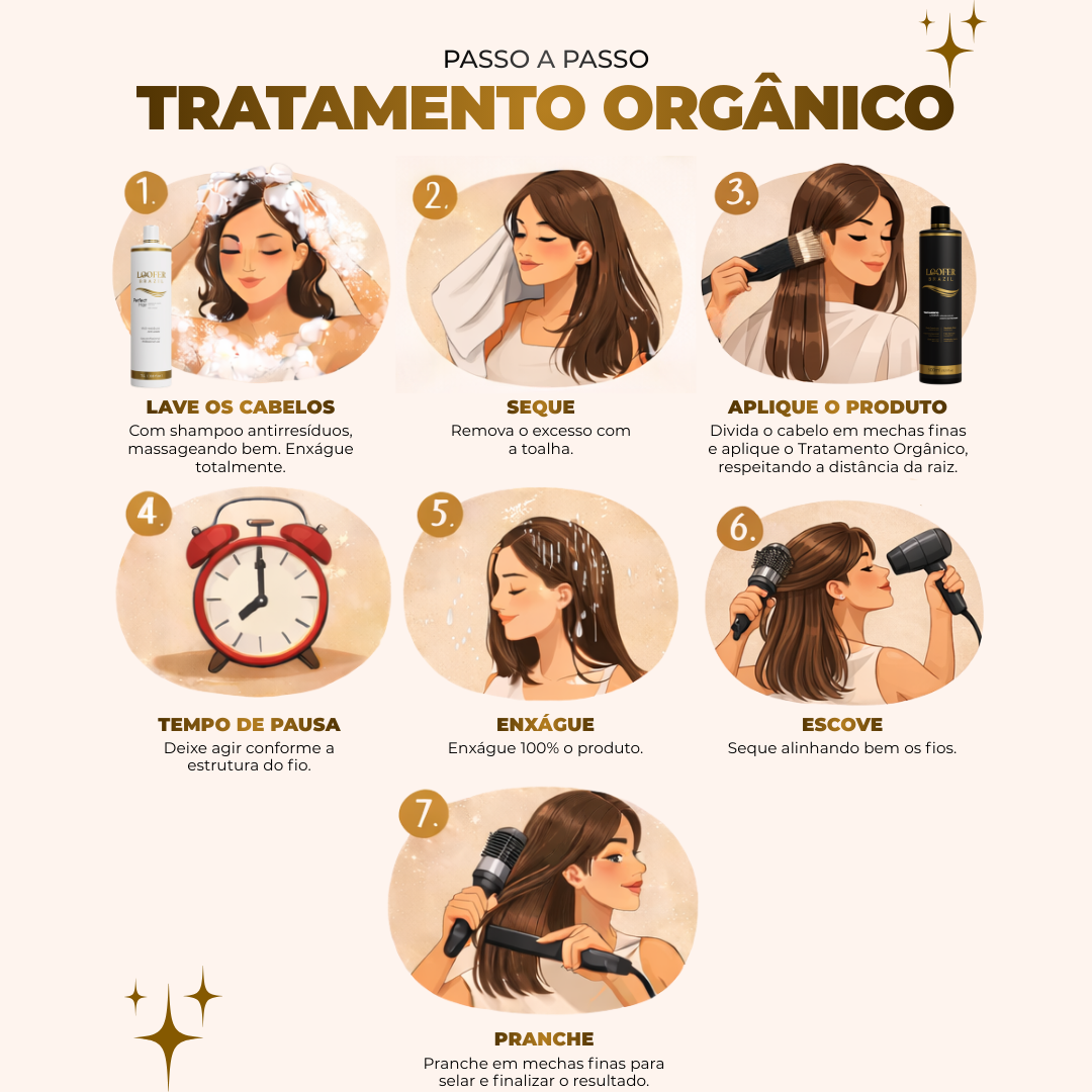 O Tratamento Orgânico não altera o tom da cor. Em cabelos muito claros ou brancos, é importante apenas ajustar corretamente a temperatura da prancha durante o selamento para preservar o tom original.
