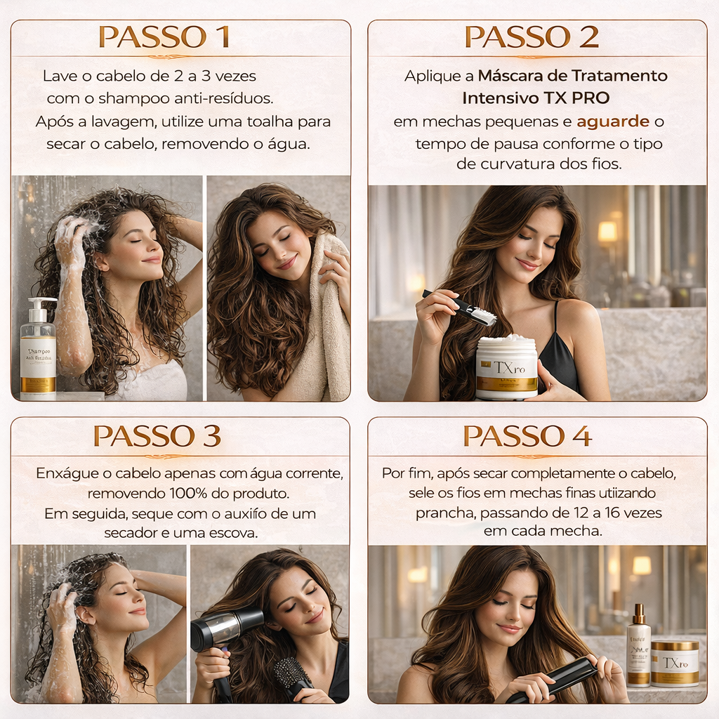 A Máscara de Tratamento Intensivo TX PRO atua diretamente na fibra capilar, promovendo: